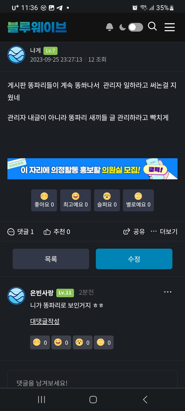 관리자 내글이 아니라 똥파리 새끼들 글 관리하라고 빡치게