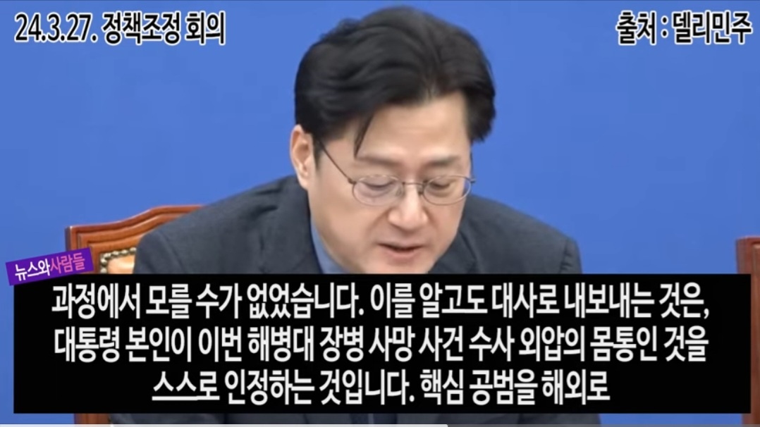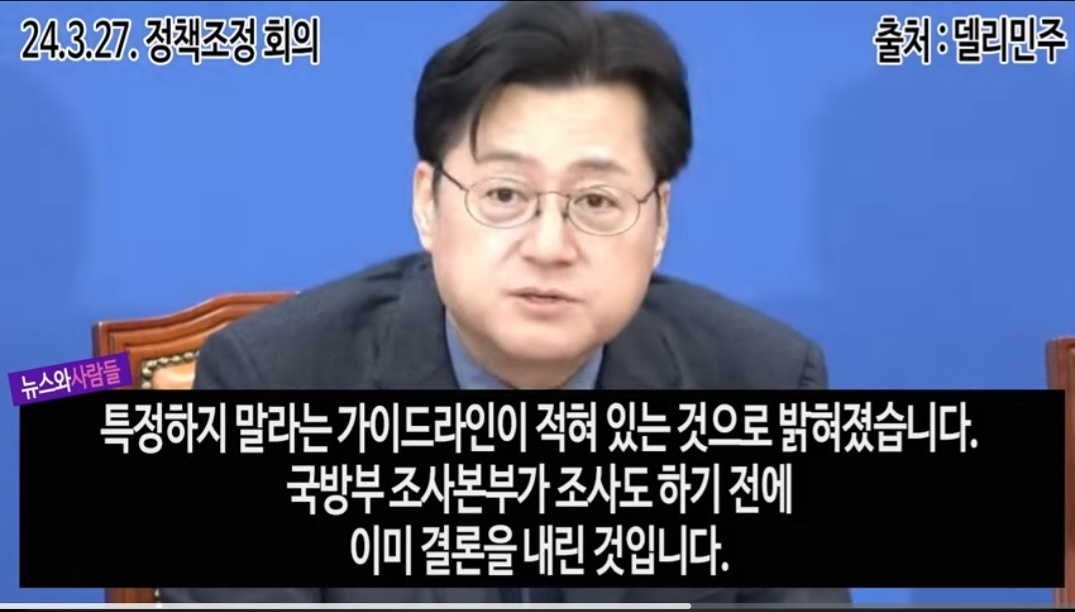 홍익표 원내대표가 이종섭 전 장관이 "임성근 전 해병대 1사단장 등 직접적 책임이 있는 관계자 혐의를 특정하지 말라는 가이드라인"을 제시했다고 하고