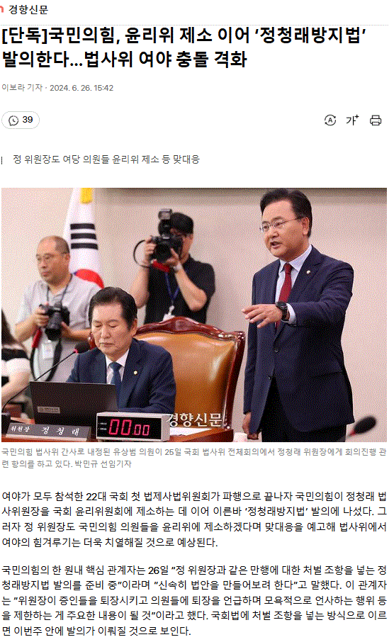 [단독] 국민의힘, 윤리위 제소 이어 ‘정청래방지법’ 발의한다…법사위 여야 충돌 격화