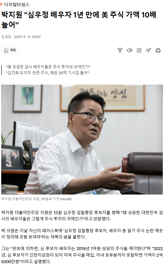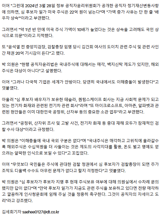 박지원 "심우정 배우자 1년 만에 美 주식 가액 10배 늘어"