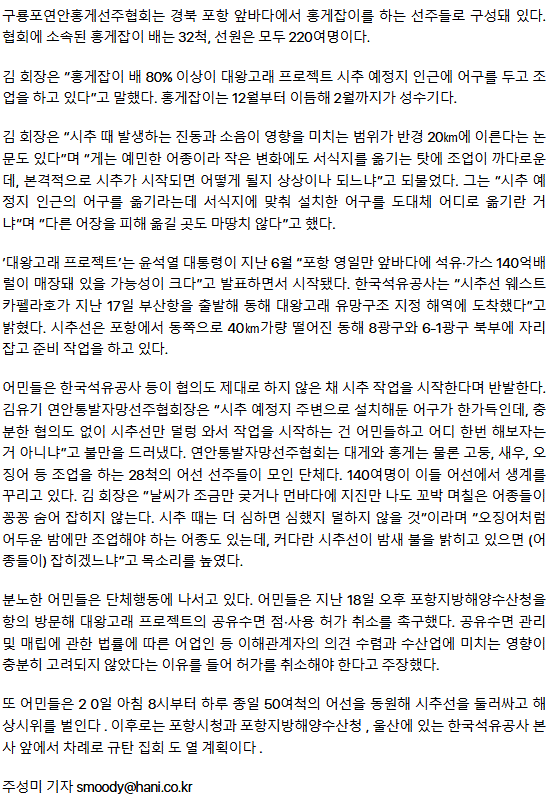 ‘대왕고래’ 시추 강행… 포항 어민들 “홍게 제철인데” 분노