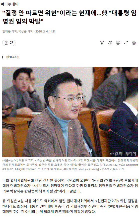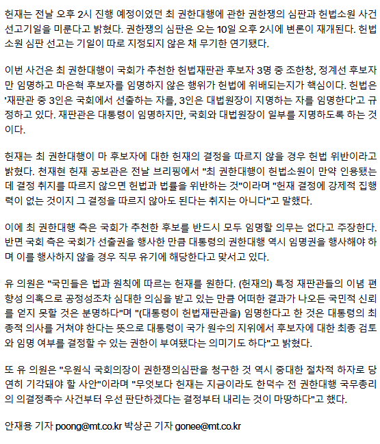 "결정 안 따르면 위헌"이라는 헌재에… 與 "대통령 임명권 임의 박탈"