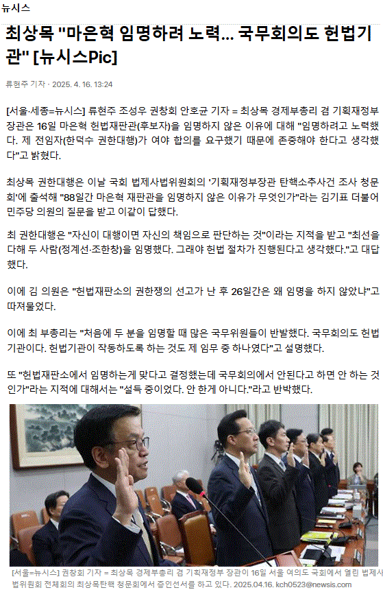 최상목 "마은혁 임명하려 노력… 국무회의도 헌법기관" [뉴시스Pic]ㅡ 멍멍이 소리하고 있네