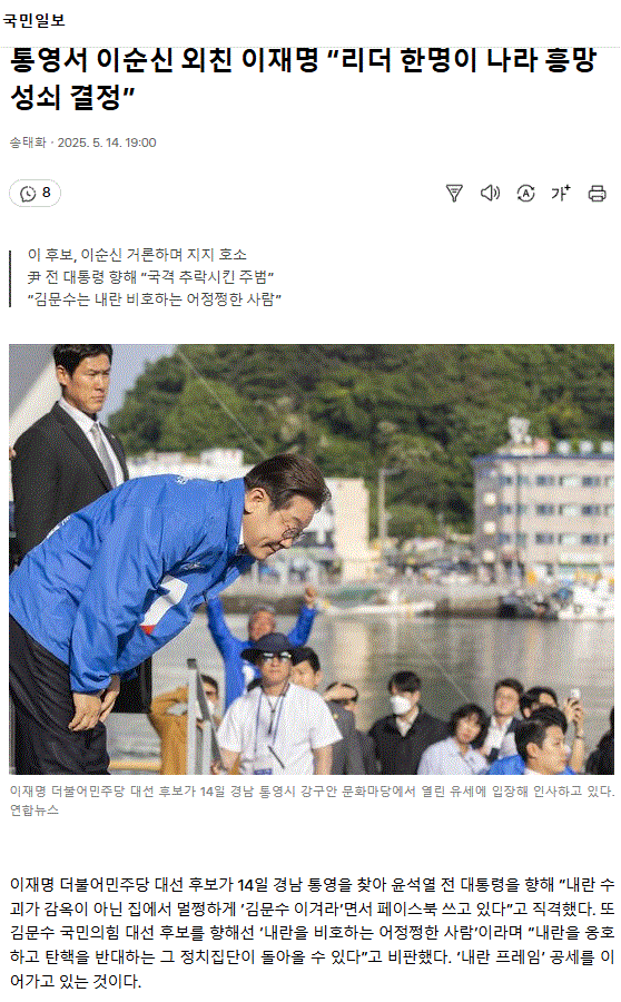 통영서 이순신 외친 이재명 “리더 한명이 나라 흥망성쇠 결정”ㅡ 리더를 잘뽑아야 나라가 산다