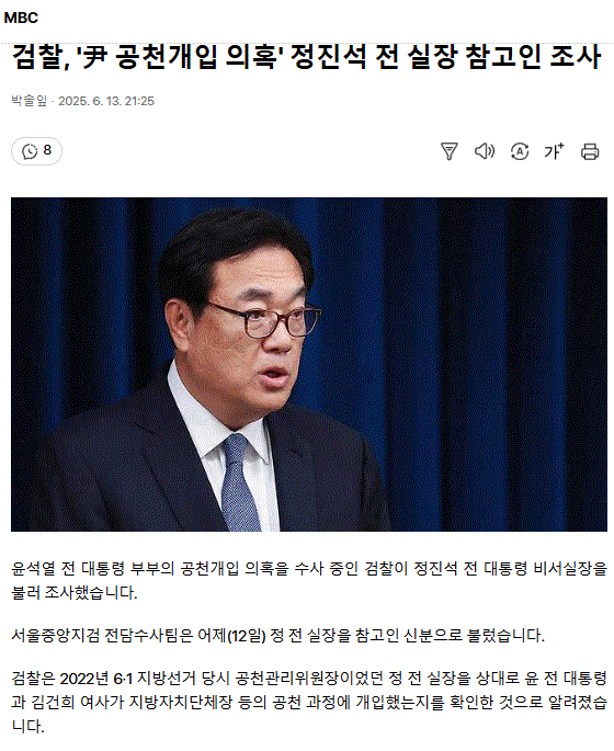 검찰, '尹 공천개입 의혹' 정진석 전 실장 참고인 조사