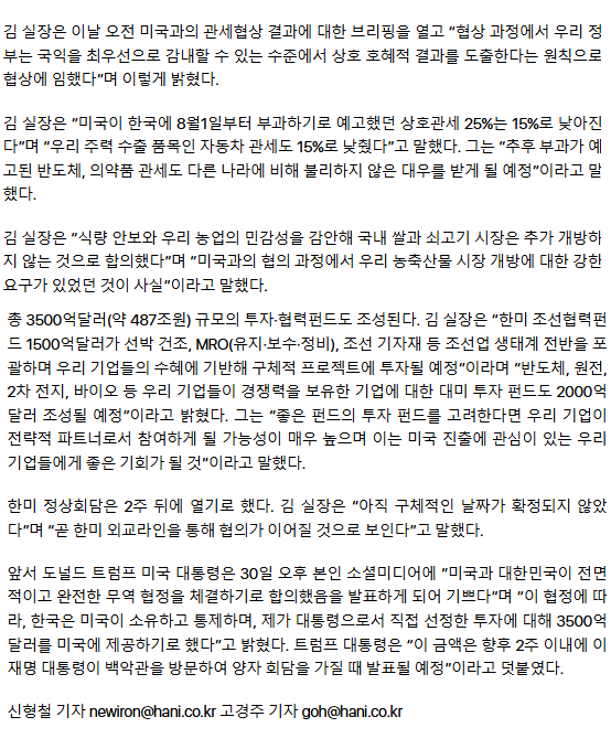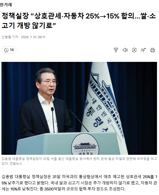 정책실장 “상호관세·자동차 25%→15% 합의… 쌀·소고기 개방 않기로”