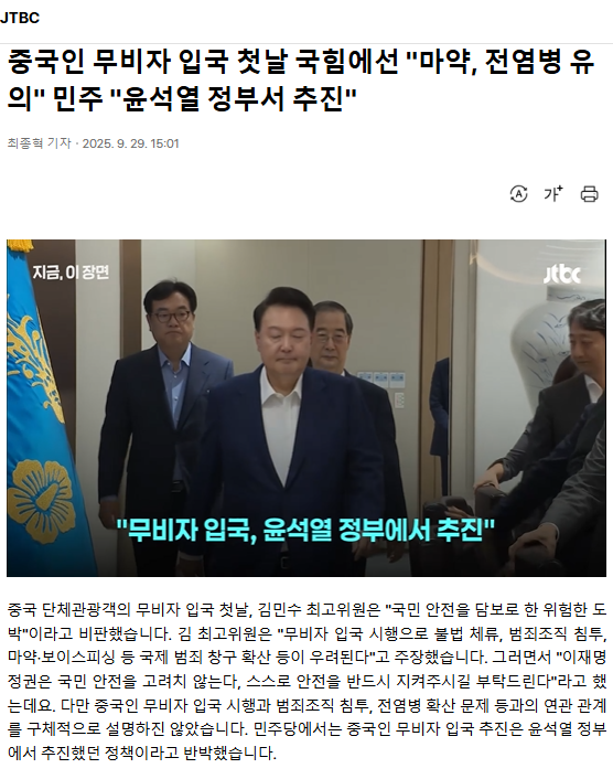 중국인 무비자 입국 첫날 국힘에선 "마약, 전염병 유의" 민주 "윤석열 정부서 추진"ㅡ 국힘 멍멍이 소리