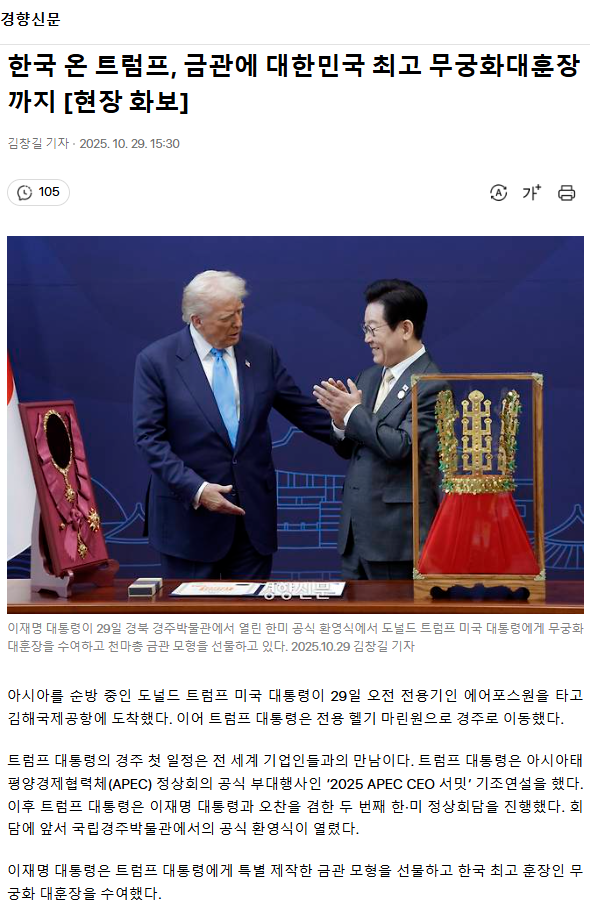 한국 온 트럼프, 금관에 대한민국 최고 무궁화대훈장까지 [현장 화보]