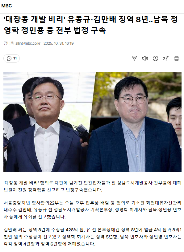 '대장동 개발 비리' 유동규·김만배 징역 8년‥ 남욱 정영학 정민용 등 전부 법정 구속 428억 추징