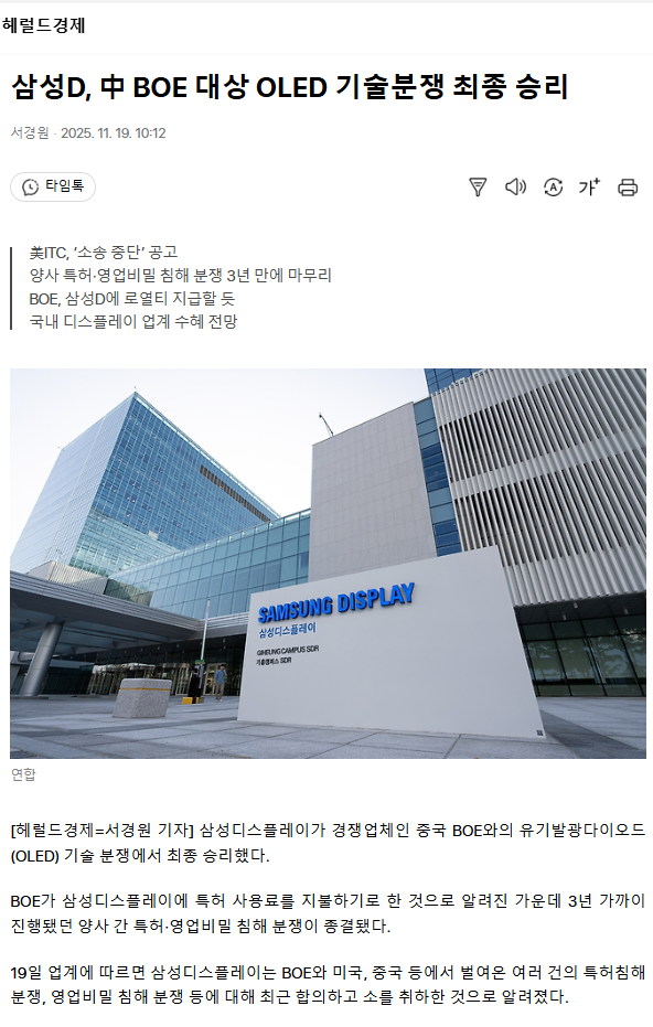 삼성D, 中 BOE 대상 OLED 기술분쟁 최종 승리