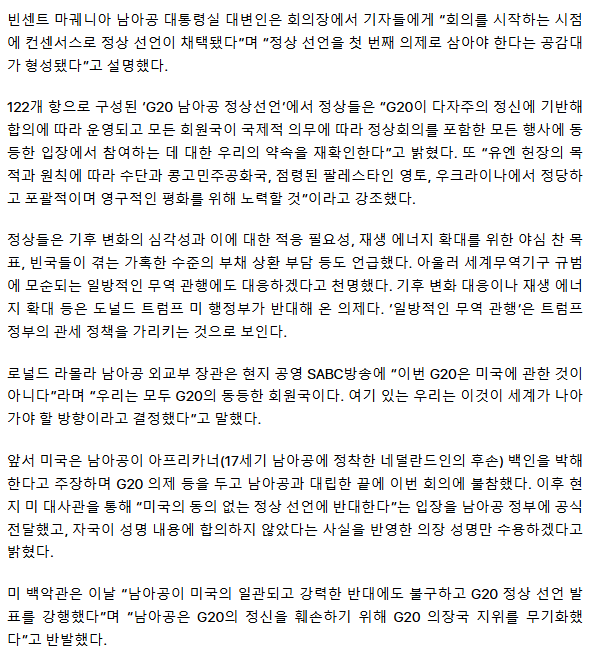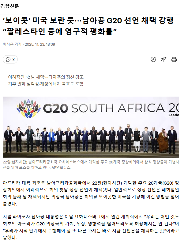 ‘보이콧’ 미국 보란 듯··· 남아공 G20 선언 채택 강행 “팔레스타인 등에 영구적 평화를”