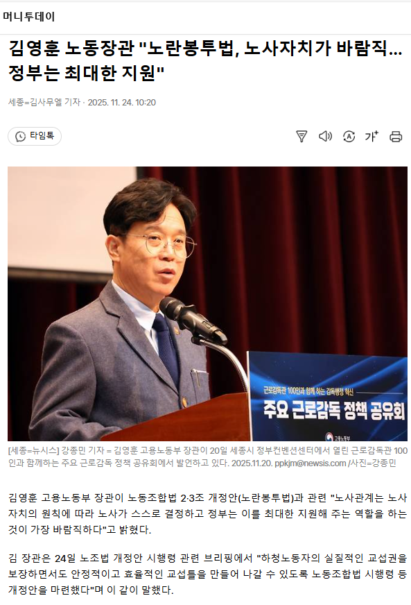 김영훈 노동장관 "노란봉투법, 노사자치가 바람직… 정부는 최대한 지원"