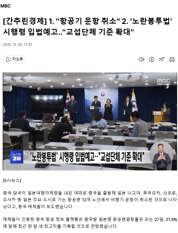 [간추린경제] 1. "항공기 운항 취소" 2. '노란봉투법' 시행령 입법예고‥ "교섭단체 기준 확대"