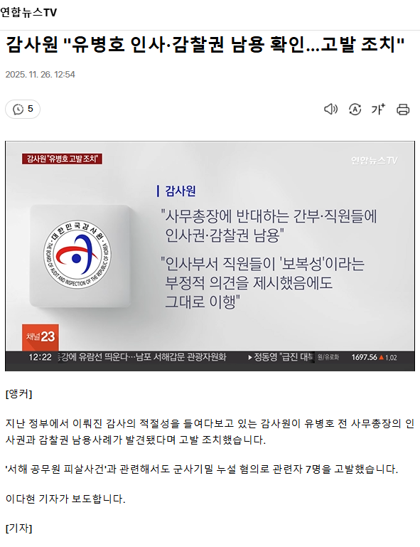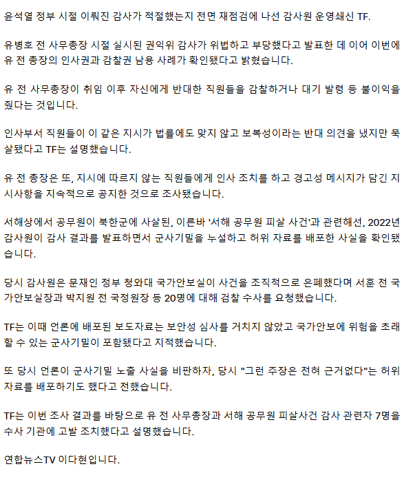 감사원 "유병호 인사·감찰권 남용 확인… 고발 조치"