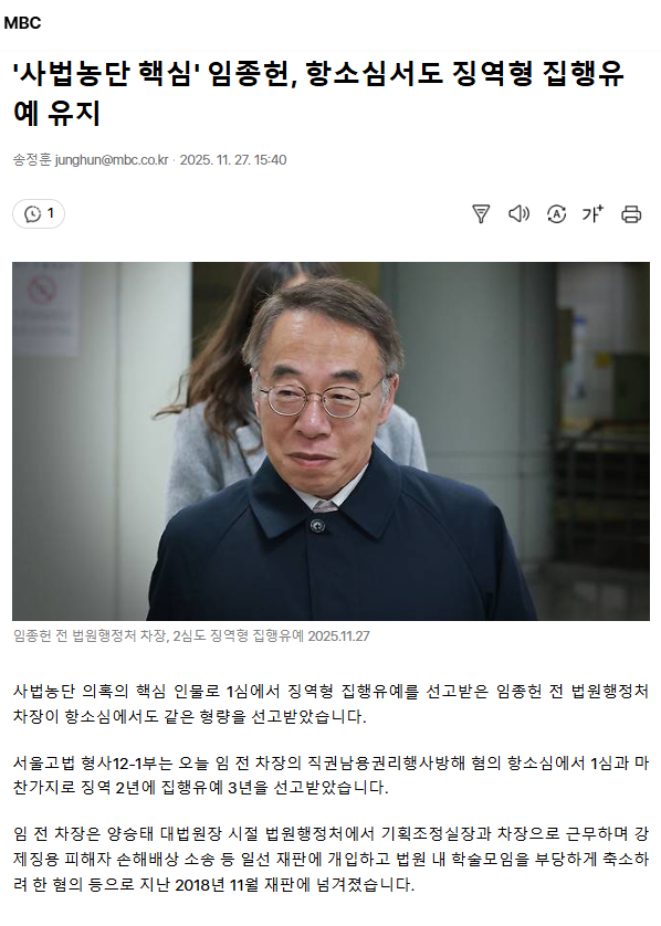 '사법농단 핵심' 임종헌, 항소심서도 징역형 집행유예 유지