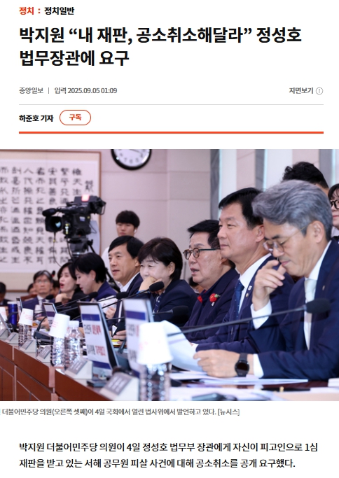 아무리 같은당 출신의 법무장관이라고 하지만 공개석상에서 자신의 재판을