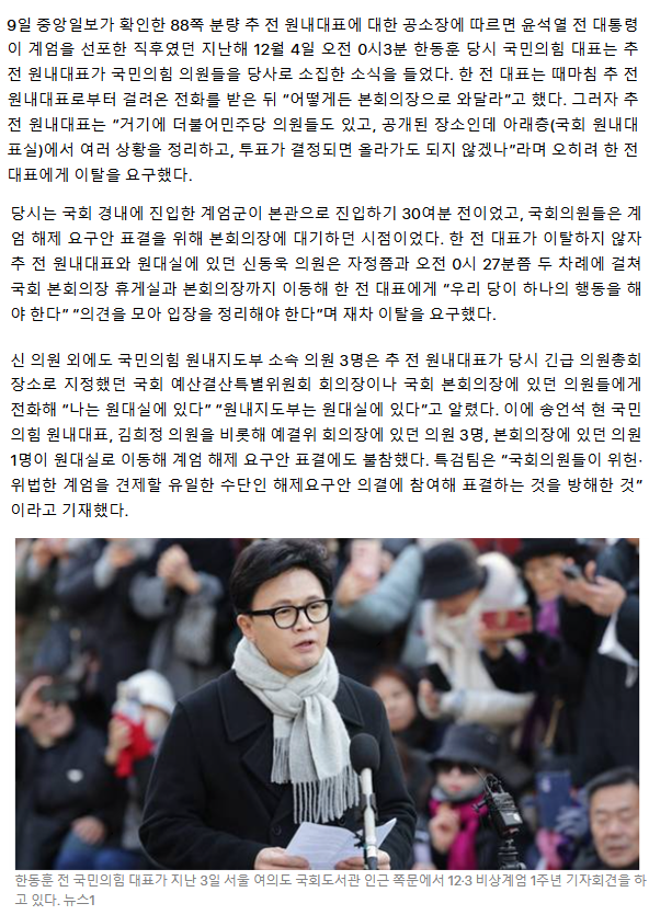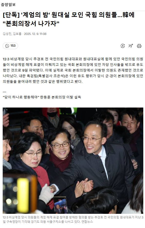 [단독] '계엄의 밤' 원대실 모인 국힘 의원들… 韓에 "본회의장서 나가자"