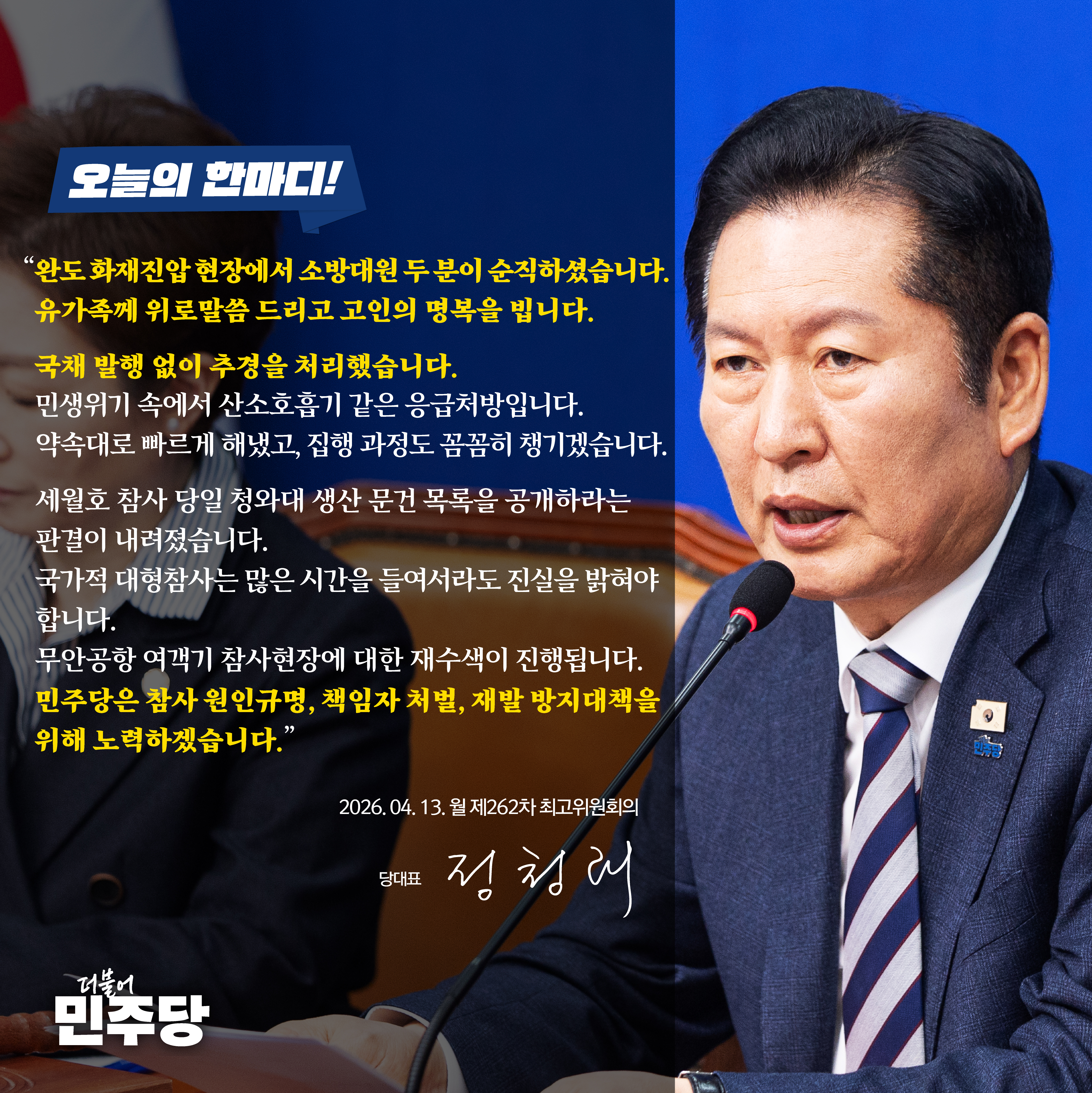 제262차 최고위원회의 모두발언 □ 일시 : 2026년 4월 13일(월) 오전 9시 30분□ 장소 : 국회 본관 당대표회의실 ■ 정청래 당대표 최고위원회의를 시작하기 전에 한 말씀 드리겠습니다. 어제 완도 화재 진압 현장에서 유증기 폭발로 인해 소방대원 두 분이 임무 중에 순직하셨습니다. 국민의 안전을 지키기 위해 불길 속으로 뛰어드셨던 그 용기와 헌신 앞에 고개 숙입니다. 두 분이 남긴 빈자리가 너무나 크고 무겁습니다. 유가족 여러분께 깊은 위로의 말씀을 드리고, 삼가 고인의 명복을 빕니다. 잠시 묵념한 후에 최고위원회의를 계속하도록 하겠습니다. 국채 발행 없이 초과 세수를 중심으로 마련된 26조 2천억 원 규모의 추경을 단 10일 만에 처리했습니다. 고유가와 고환율, 고물가에 고통받는 국민의 부담을 보다 빠르고 적극적으로 덜어드릴 수 있게 되어서 매우 다행입니다. 우리 민생경제의 안정을 위해 역사적으로 가장 빠른 속도로 처리하겠다는 약속도 지키게 되었습니다. 이번 추경을 통해 정부는 하위 70% 약 3,256만 명의 국민께 10만 원에서 60만 원까지 민생지원금을 지급합니다. 현장에 가보면 기대가 큽니다. 고유가에 따른 피해를 지원하면서 동시에 실생활 소비로 바로 연결하기 위한 방법입니다. 경제 활력이 돌면 불안한 마음도 이겨내고 다시 더 큰 활력의 선순환을 이뤄낼 수 있을 것입니다. 정액형 K-패스도 한시적으로 반값 수준으로 낮춰 대중교통 이용의 부담을 덜었습니다. 전국적으로 차량 5부제·2부제가 시행되는 가운데 정부안 877억 원에 국회가 1,027억 원을 증액해 교통비 부담을 직접 낮추는 체감형 지원을 대폭 강화했습니다. 고유가로 피해 입은 농어민, 연안 여객선, 전세버스에도 국회가 약 1천억 원을 증액해 더 큰 지원이 가능해졌습니다. 제가 경상북도 영덕에 가서 새벽 1시부터 4시까지 청어잡이배를 타고 새벽 5시에 수협 어민들과 정책 간담회를 했는데 그때 어민들께서 요구하셨던 선박 기름값 보전 문제도 담았습니다. 강원도 철원에 갔을 때 우상호 후보가 강원도는 관광객이 많이 와야 하는데 전세버스가 부담되니 전세버스 기름값 보전 부분에 대해서도 이야기를 해서 이 부분도 담았다는 말씀을 드립니다. 수급이 불안정한 산업·농축산 원자재에 대한 지원도 확대했습니다. 나프타 수급 안정에 2,049억 원, 농업용 무기질 비료액 73억 원, 축산용 사료 지원에 500억 원을 추가 지원합니다. 국민께서 우려하셨던 종량제 봉투 수급 문제에 대응하기 위한 재생 원료 설비 지원도 138억 원 반영됐습니다. 석유 의존도를 낮추고 기후 위기에 대응하기 위해 재생에너지 예산도 대폭 늘렸습니다. 아파트 베란다 가정용 태양광 국비보조율을 최대 40%까지 상향해 125억 원을 추가 배정했고, 전기승용차 2만 대 추가 보급을 위해 600억 원을 더 증액했습니다. 아울러 지방재정 보강을 위해 약 10조 원 규모의 재원을 함께 반영했습니다. 1조 원은 국채 순상환에 사용한 재정 건전성 확보도 놓치지 않았습니다. 이번 추경은 민생 위기 속에서 민생을 지키고 숨이 넘어갈 듯한 국민에게 산소호흡기와도 같은 응급처방입니다. 에너지 재전환의 기반을 넓히는 추경입니다. 약속대로 빠르게 제대로 해냈고 집행 과정도 꼼꼼히 챙기겠습니다. 이번 추경 과정에서 고생하신 이소영 예결위 간사, 진성준 예결위원장께 감사드리고 가장 빠르고 정확하게 결단하고 실행으로 옮겨준 우리 한병도 원내대표님, 생각대로 잘하셨습니다. 고생하셨습니다. 한병도 원내대표님, 우리 천준호 수석님, 원내지도부께 감사드립니다. 지난 금요일 세월호 참사 당일 박근혜 정부 청와대에서 생산한 세월호 7시간 문건의 목록을 공개하라는 법원 판결이 내려졌습니다. 대법원에서 고등법원으로 다시 심리하라며 돌려보낸 지 1년 3개월, 2017년 행정소송이 제기된 지 무려 8년 만의 결정입니다. 그날의 진실을 밝히라는 희생자 가족과 국민의 뜨거운 외침이 있는 한 세월호 7시간의 진실은 반드시 밝혀져야 합니다. 세월호 참사가 발생한 지 벌써 12주기를 앞두고 있습니다. 박근혜 정권의 무책임한 대응으로 희생된 세월호 희생자들의 넋을 깊이 애도합니다. 가족들께도 깊은 위로를 전합니다. 국가적 대형 참사는 많은 시간을 들여서라도 모든 진실을 한 점 의혹도 남김없이 밝혀내야 한다는 것을 강조합니다. 그것이 국가의 의무입니다. 아울러 오늘부터 두 달간 12·29 무안공항 여객기 참사 현장에 대한 정부 차원의 정밀 재수색이 진행됩니다. 이재명 대통령이 방침을 밝혔습니다. 이번 재수색에는 차원의 정밀 재수색이 진행됩니다. 이번 재수색에는 민·관·군·경 합동으로 약 250명이 투입되며 공항 내부는 물론이고 외곽의 담장까지, 공항 외부까지 전방위적인 수색이 이뤄집니다. 윤석열의 12·3 비상계엄 내란 이후 한 달도 지나지 않아 발생했던 국가적 대형 참사인 만큼 초기 수습이 매우 부실하게 이루어졌고 원인 규명을 위한 초기 조사도 매우 미흡했던 당시 정황을 철저히 재조사해야 합니다. 더불어민주당은 앞으로도 12·29 무안공항 여객기 참사의 철저한 사고 원인 규명과 책임자 처벌, 재발 방지 대책 마련을 위해 당 차원에