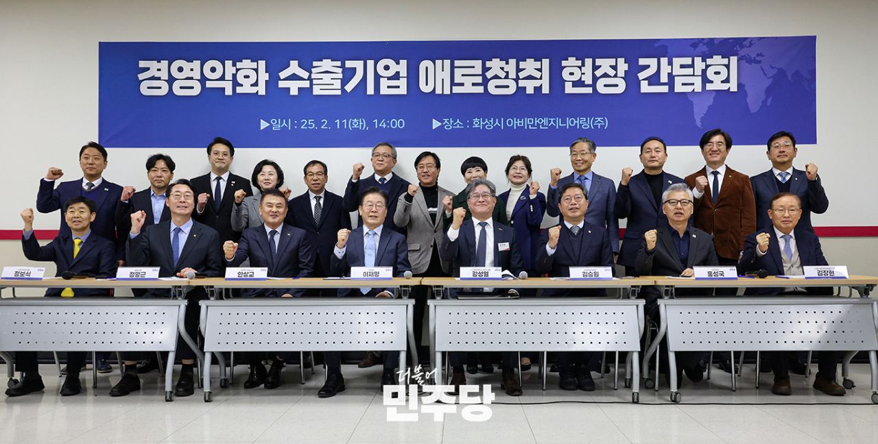 이재명 당대표가 2025.02.11.(화) 화성 아비만엔지니어링(주)에서 열린 경영악화 수출기업 애로 청취를 위한 현장 간담회에 참석하여 기념 촬영을 하고 있다.