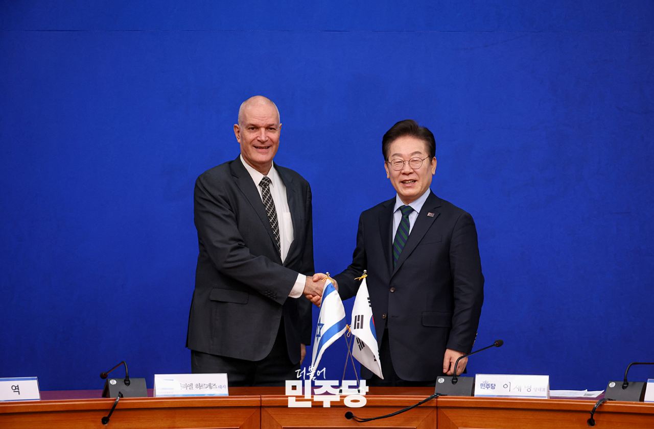 이 이재명 당대표가 2025.02.13.(목) 국회 본청 당대표회의실에서 라파엘 하르페즈 주한 이스라엘 대사를 접견하며 기념 촬영을 하고 있다.