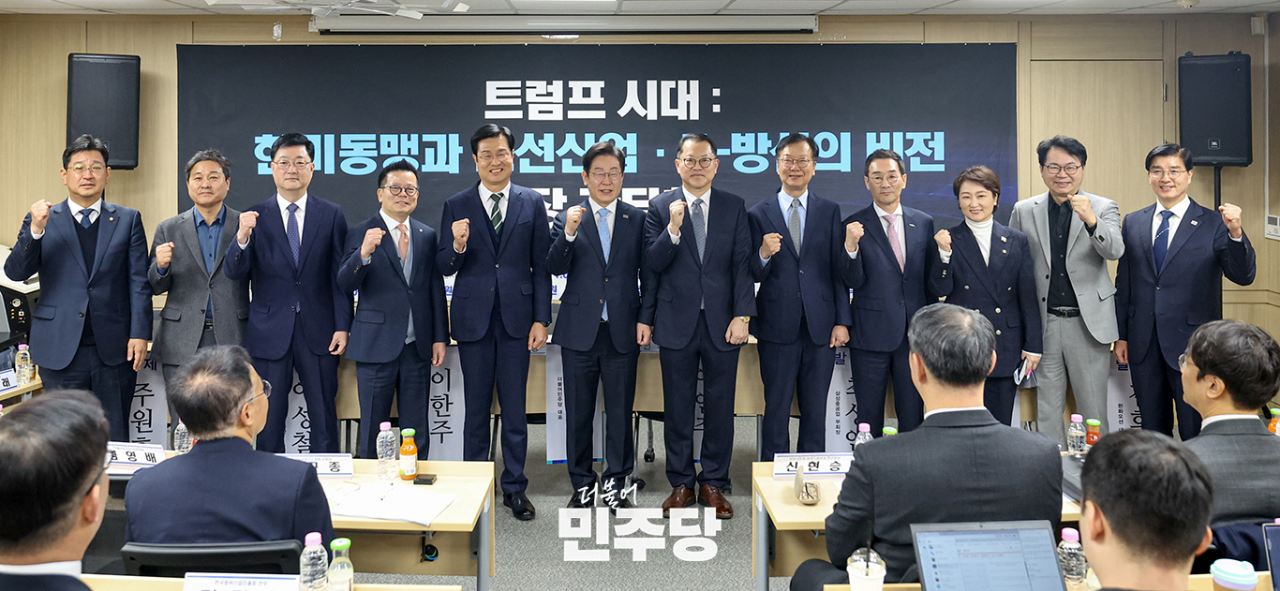 이재명 당대표가 2025.02.19.(수) 서울 마포구에 위치한 한국방위산업진흥회 회의실에서 열린 <트럼프 시대: 한미동맹과 조선산업·K-방산의 비전> 현장 간담회에 참석하여 기념 촬영을 하고 있다.