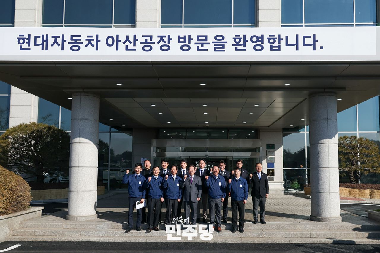 이재명 당대표가 2025.02.20.(목) '국제 통상 환경 변화 대응방안 모색을 위한 자동차 산업 현장 간담회'가 열린 현대자동차 아산공장을 방문하여 기념 촬영을 하고 있다.