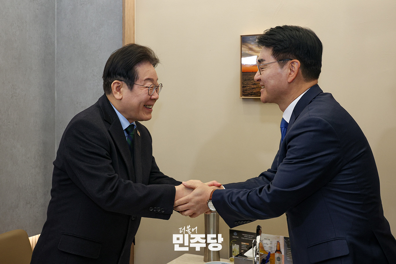 이재명 당대표가 2025.02.21.(금) 서울 여의도 한 식당에서 박용진 전 국회의원과 만나 대화하고 있다.