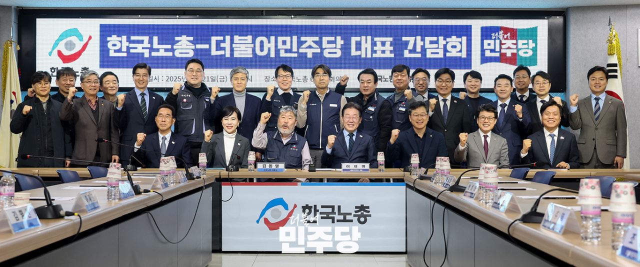 이재명 당대표가 2025.02.21.(금) 서울 여의도 한국노동조합총연맹 대회의실에서 열린 한국노총 현장간담회에 참석하여 기념 촬영을 하고 있다.