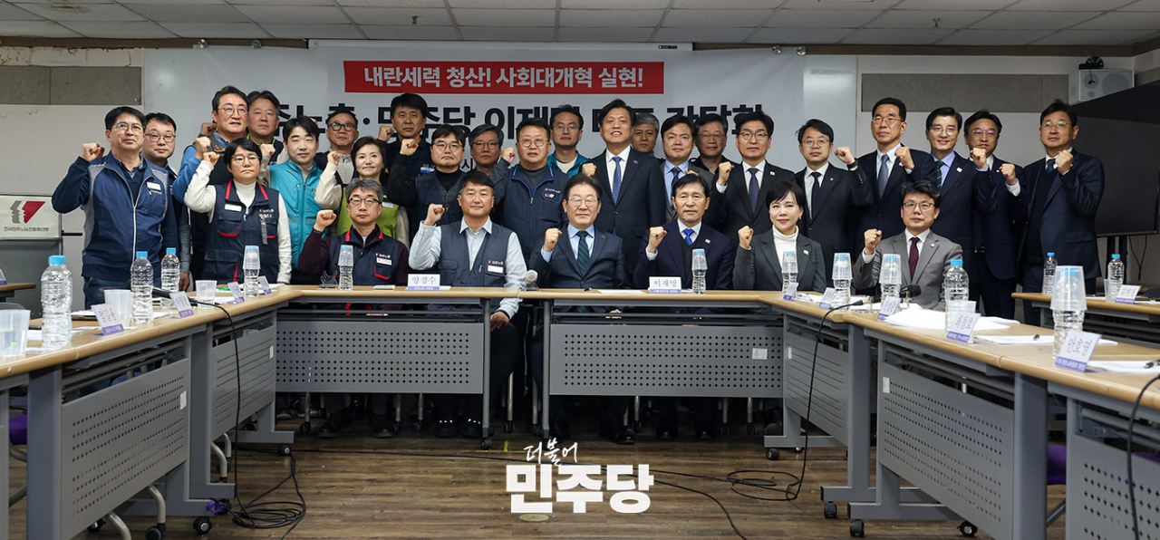 이재명 당대표가 2025.02.21.(금) 서울 중구 전국민주노동조합총연맹에서 열린 민주노총 현장간담회에 참석하여 기념 촬영을 하고 있다.