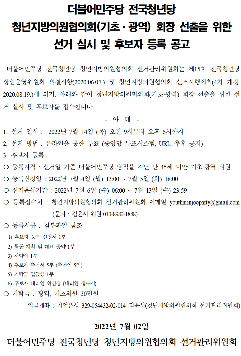 더불어민주당 전국청년당 청년지방의원협의회(기초·광역) 회장 선출을 위한 선거 실시 및 후보자 등록 공고