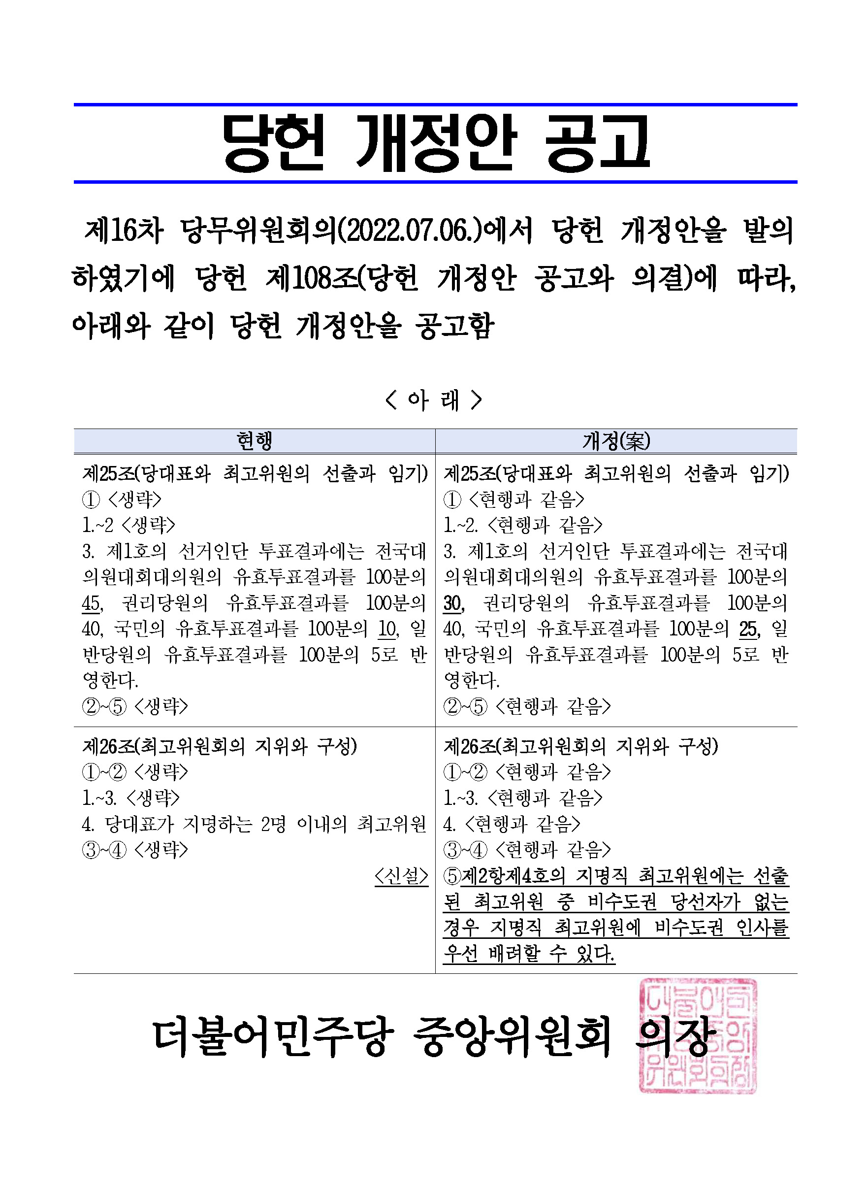 제5차 중앙위원회 소집 및 당헌 개정안 공고