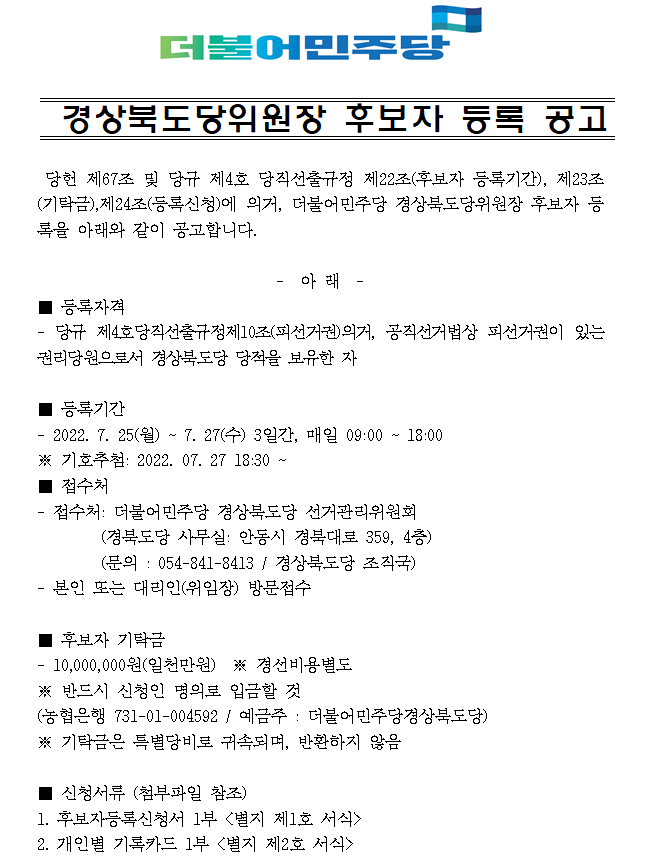 경상북도당위원장 후보자 등록 공고