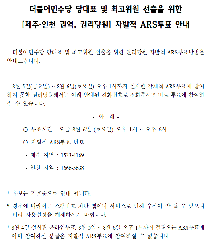 더불어민주당 당대표 및 최고위원 선출을 위한 [제주·인천 권역, 권리당원] 자발적 ARS투표 안내