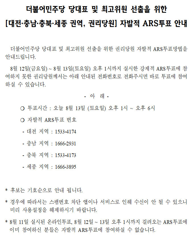 더불어민주당 당대표 및 최고위원 선출을 위한 [대전·충남·충북·세종 권역, 권리당원] 자발적 ARS투표 안내