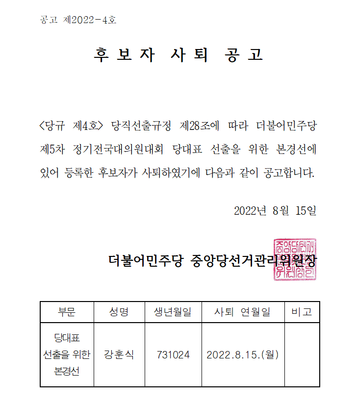 당대표 후보자 사퇴 공고