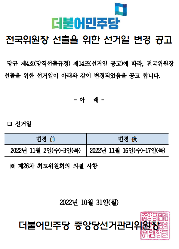 전국위원장 선출을 위한 선거일 변경 공고