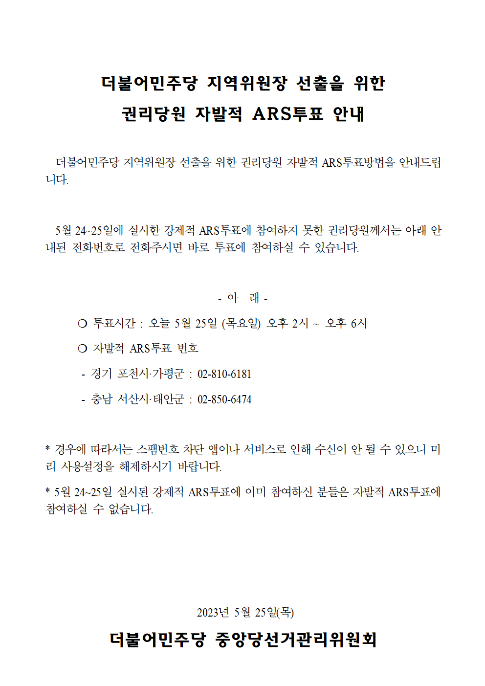 더불어민주당 지역위원장 선출을 위한 권리당원 자발적 ARS 투표 안내