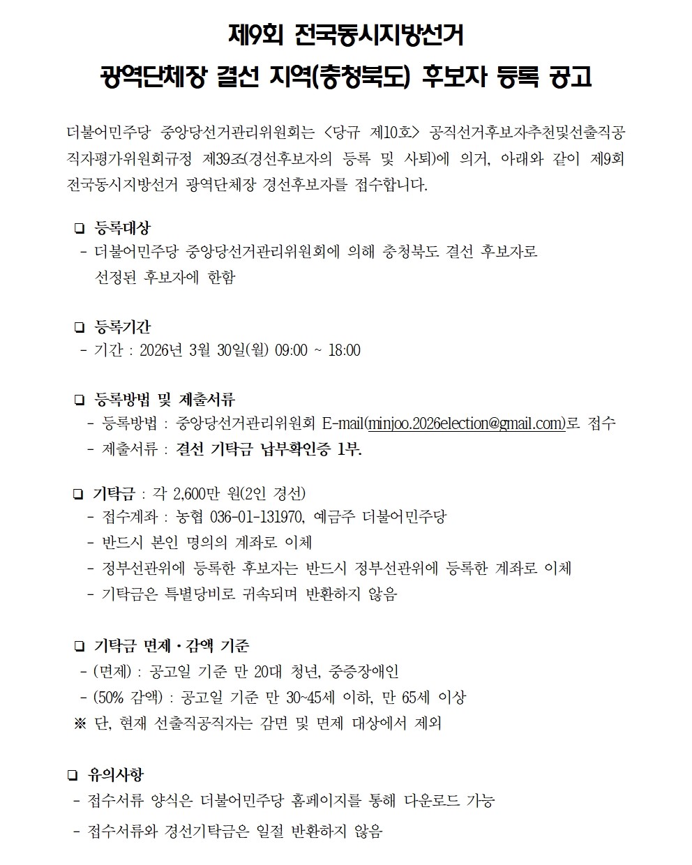 제9회 전국동시지방선거 광역단체장 결선지역(충청북도) 후보자 등록 공고