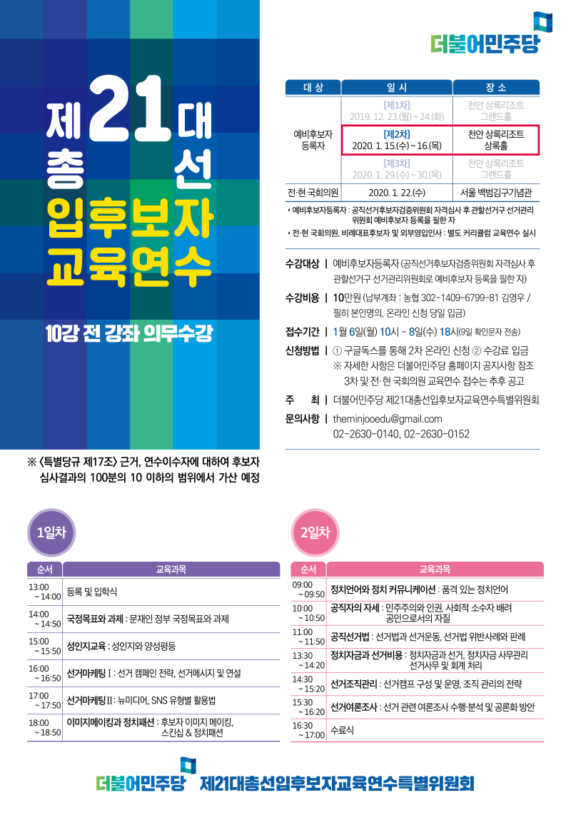 더불어민주당 21대총선입후보자교육연수특별위원회는 제21대 총선 입후보자를 대상으로 제2차 교육연수를 아래와 같이 진행합니다. 모든 입후보자는 의무적으로본 교육연수를 이수하여야 합니다.