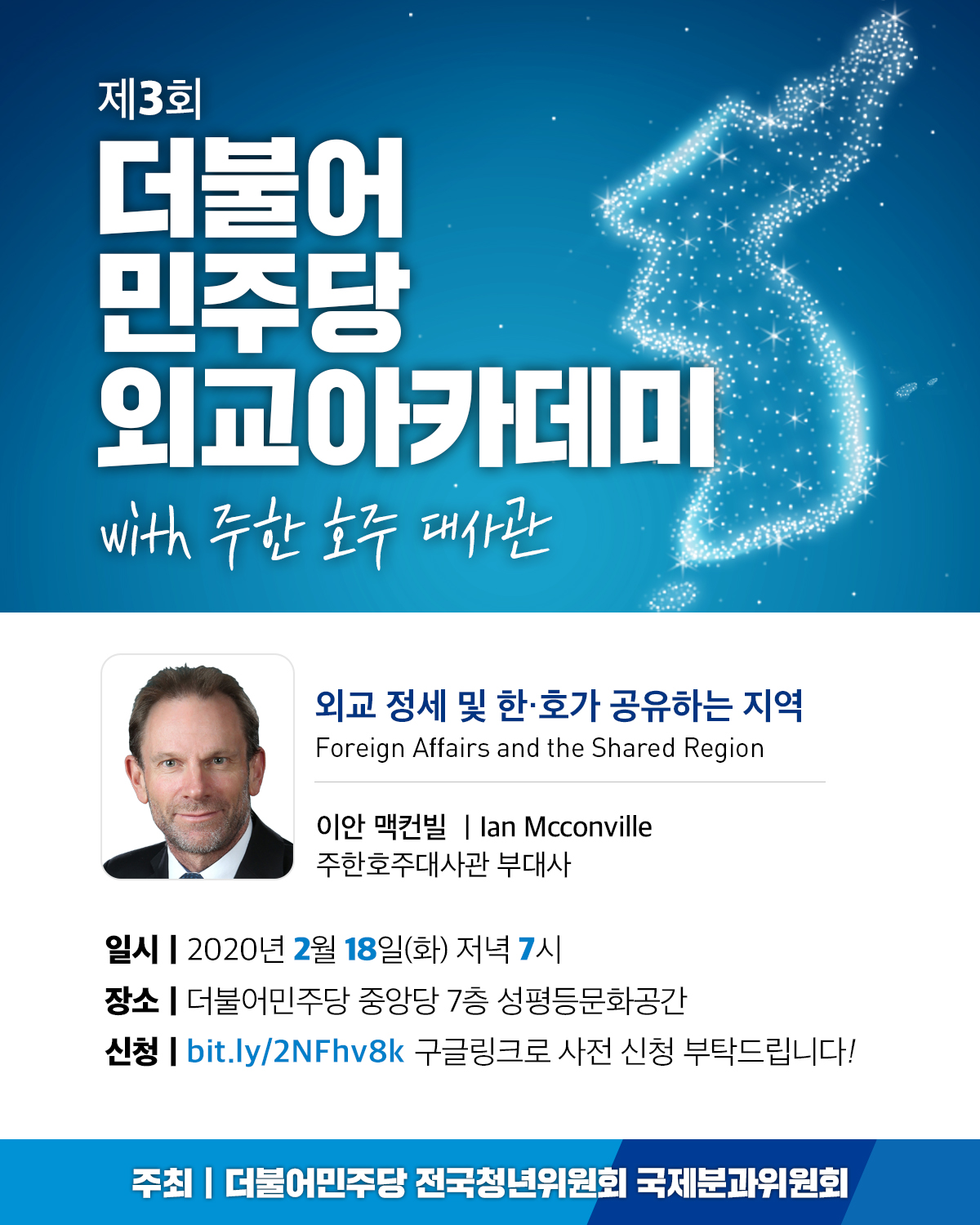 2월에는 주한호주대사관 이안 맥컨빌(Ian Mcconville) 부대사를 모시고, “외교 정세 및 한-호가 공유하는 지역 (Foreign Affairs and the Shared Region)”에 대한 이야기를 나눠보고자 합니다.