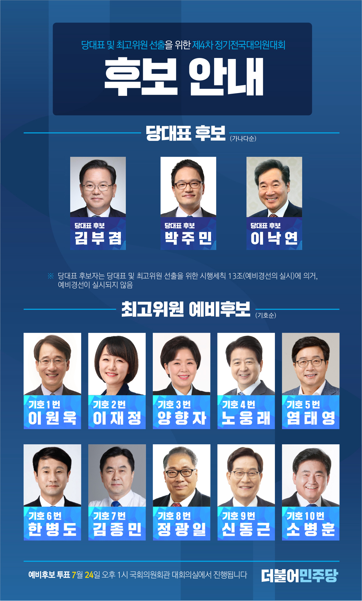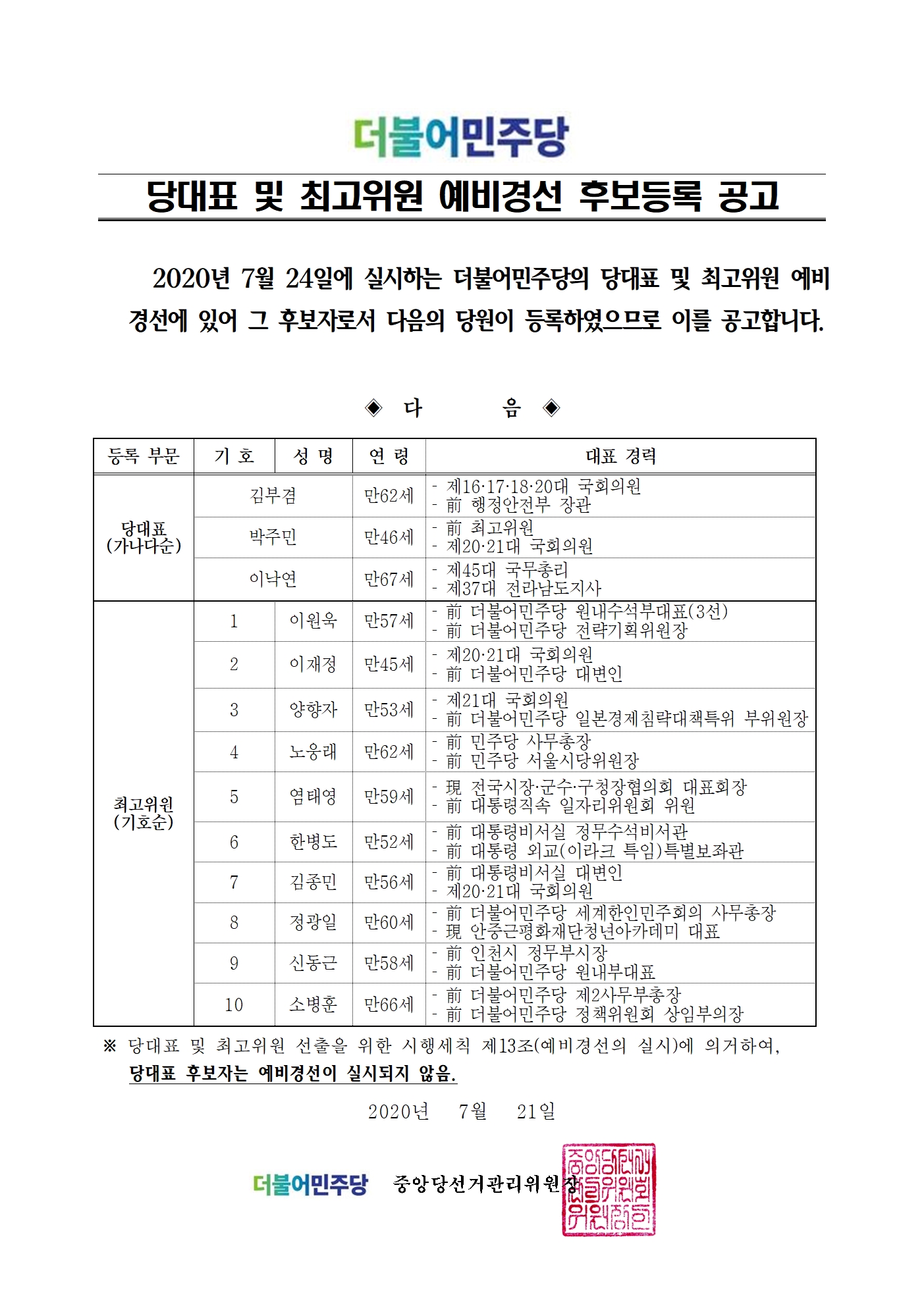 더불어민주당 당대표 및 최고위원 예비경선 후보등록 공고