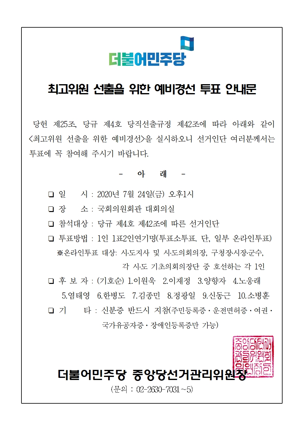 최고위원 선출을 위한 예비경선 투표 안내문, 7.24.(금)