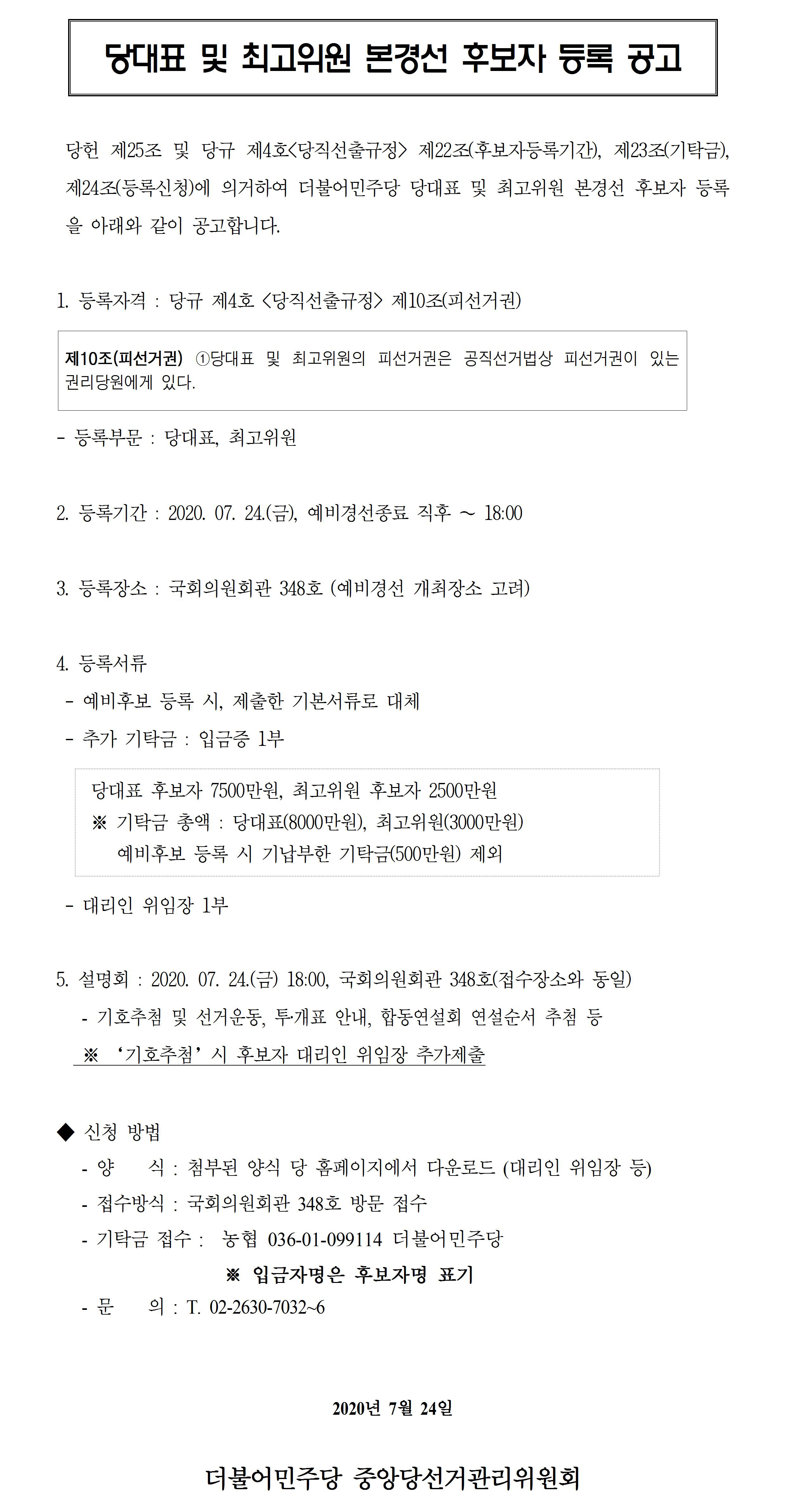 당대표 및 최고위원 본경선 후보자 등록 공고