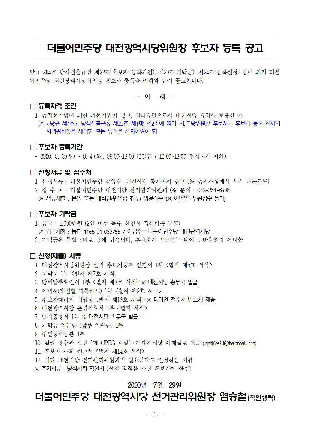더불어민주당 대전광역시당 위원장 후보자 등록 공고