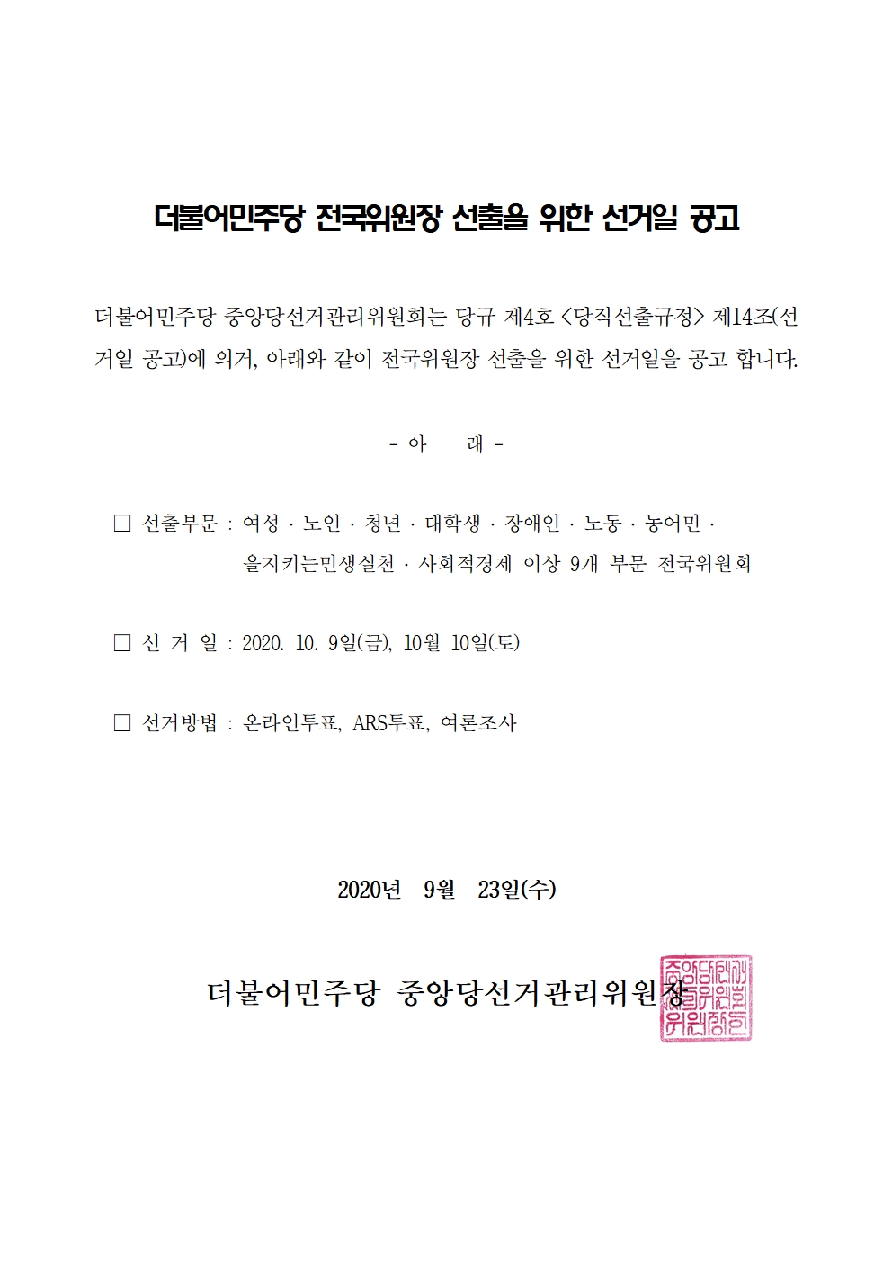 더불어민주당 전국위원장 선출을 위한 선거일 공고