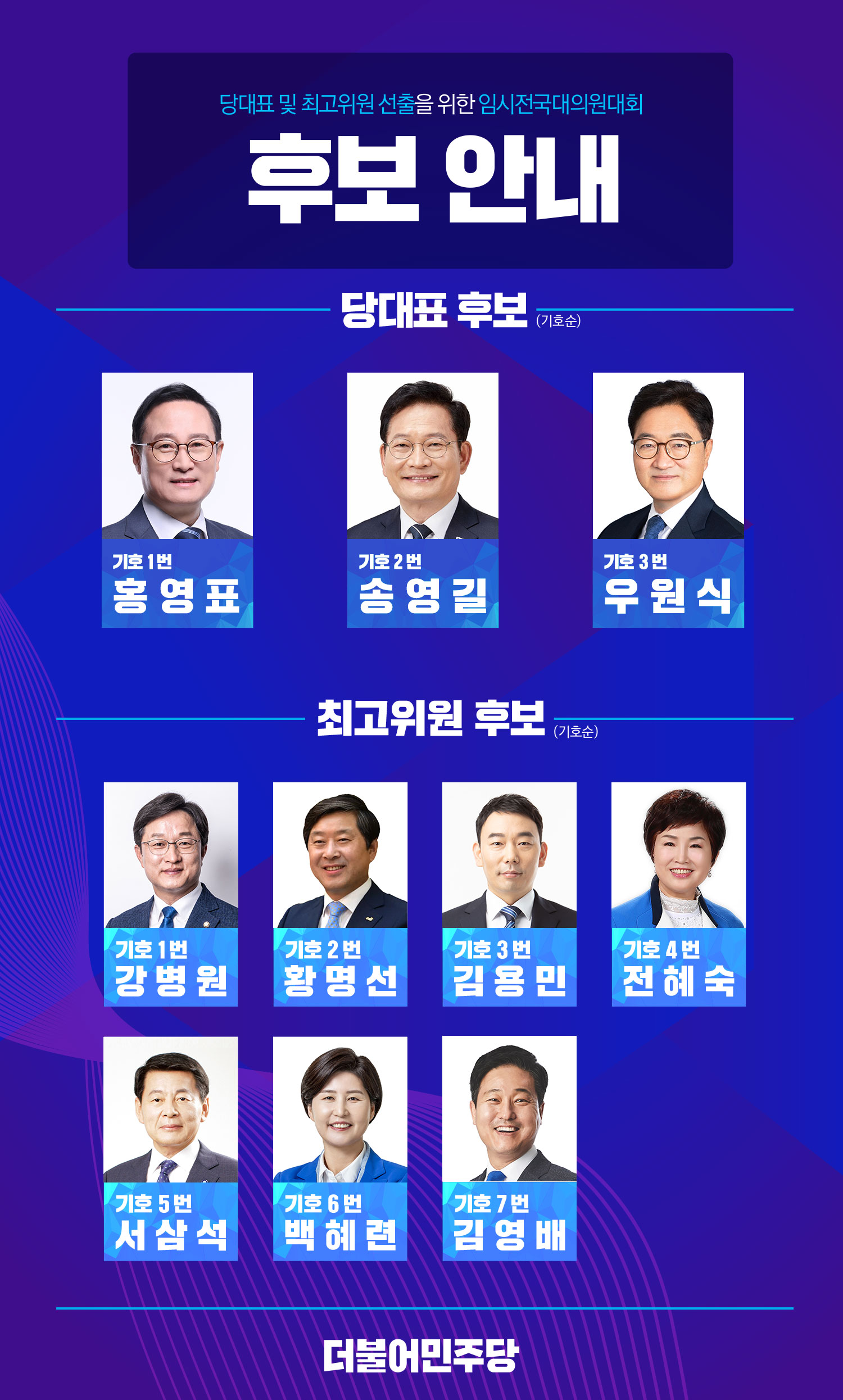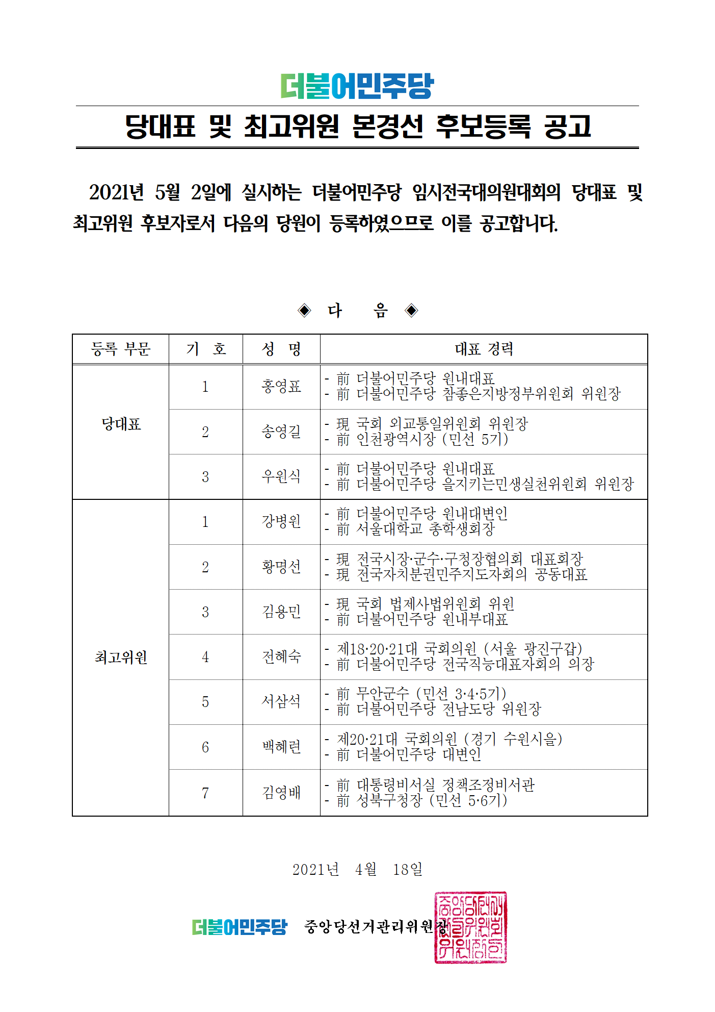 당대표 및 최고위원 본경선 후보등록 공고