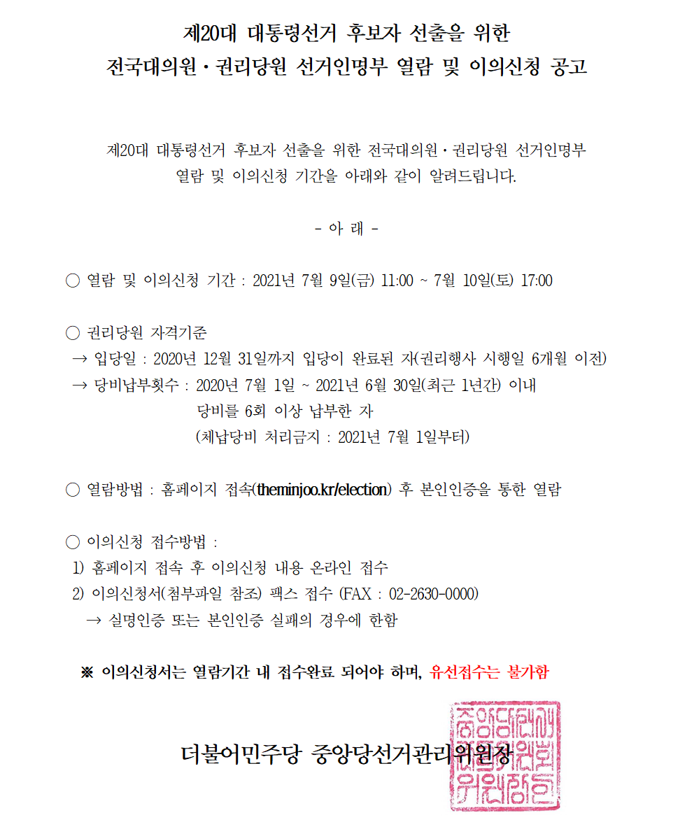 제20대 대통령선거 후보자 선출을 위한 전국대의원·권리당원 선거인명부 열람 및 이의신청 공고