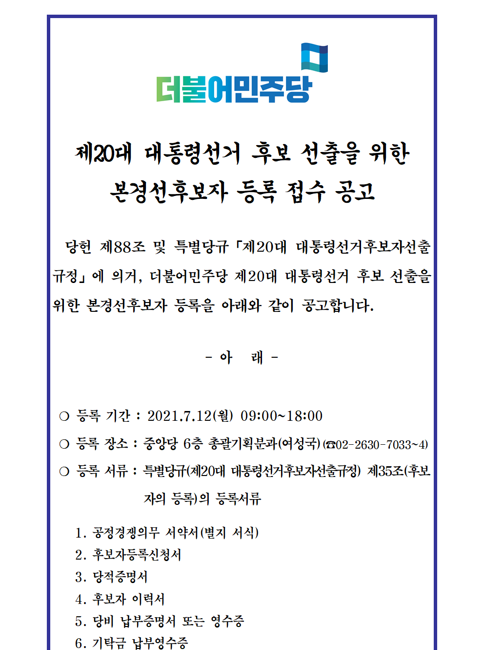 제20대 대통령선거 본경선 후보등록 공고