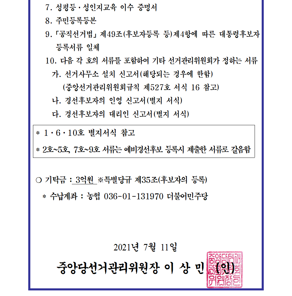 제20대 대통령선거 후보 선출을 위한 본경선후보자 등록 접수 공고