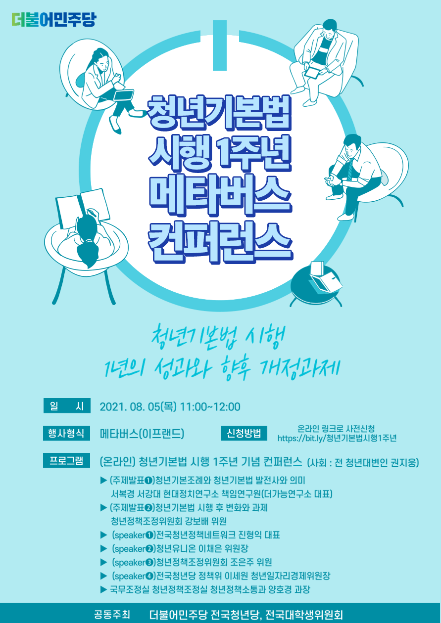 더불어민주당 전국청년당·전국대학생위원회에서 청년기본법 시행 1주년 기념 메타버스(가상공간) 컨퍼런스를 개최합니다.